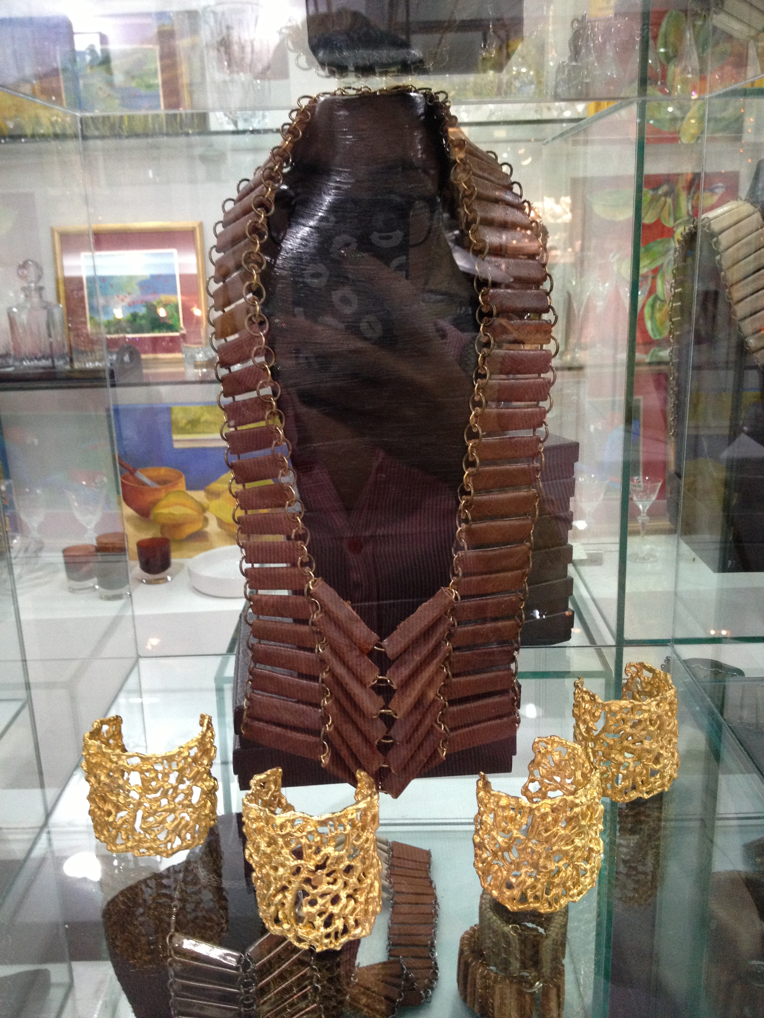 Unable to find a way to source the necklace without going straight to Anya herself, I opted to have a similar one commissioned from Afiya Bishop (who also makes jewellery, incase you didn’t know). While I still love that necklace by Afiya, I was thrilled to discover that the designer of Anya’s necklace (whose name had, up to that time, been unknown to me), Kristy Collado, had launched her line – called Chejo – in The Gallery in Long Circular Mall. My friends Mel and Shani had attended the launch and Mel live tweeted photos of the pieces. There was my baby, right in front my eyes.