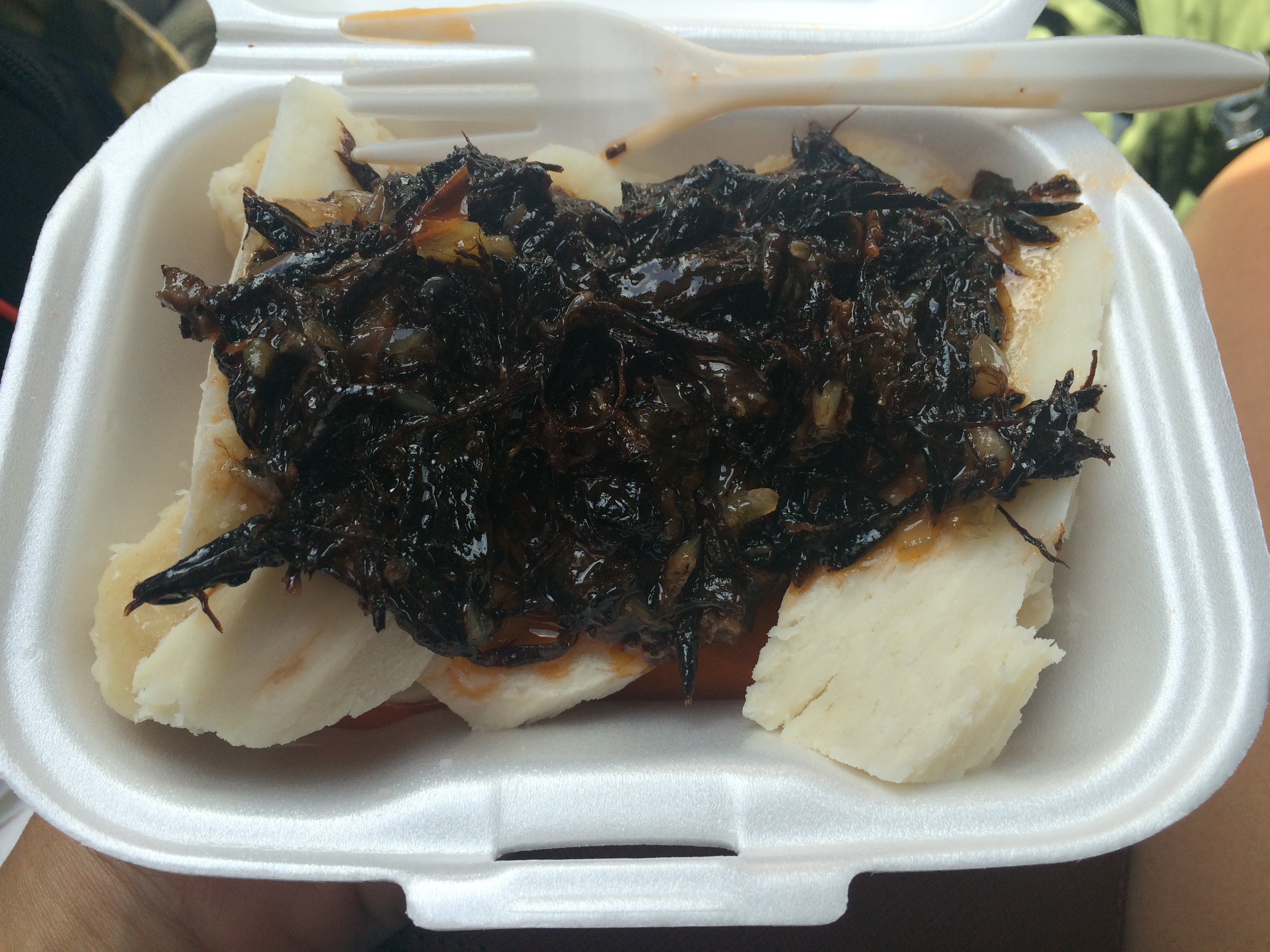 So this may be a smidge controversial, but along the Leeward coast, we stopped at a food truck near the fishing town of Barrouallie to sample the ‘black fish’ or pilot whale, which is still hunted in St Vincent. The meat itself had a texture reminiscent of smoked herring, but it obviously wasn’t smoked. Delicious really…and the yam and coconut dumplings were a great accompaniment.