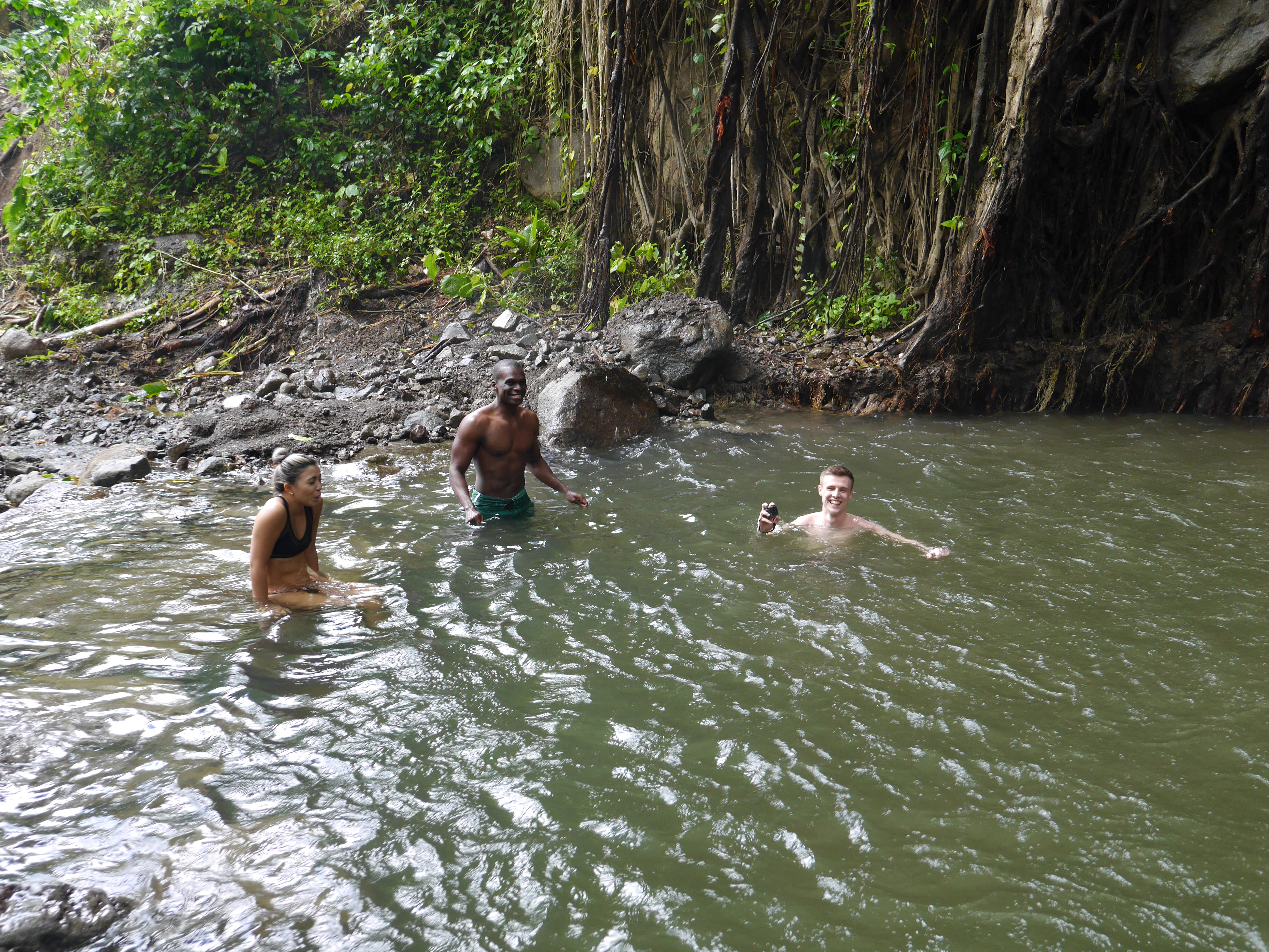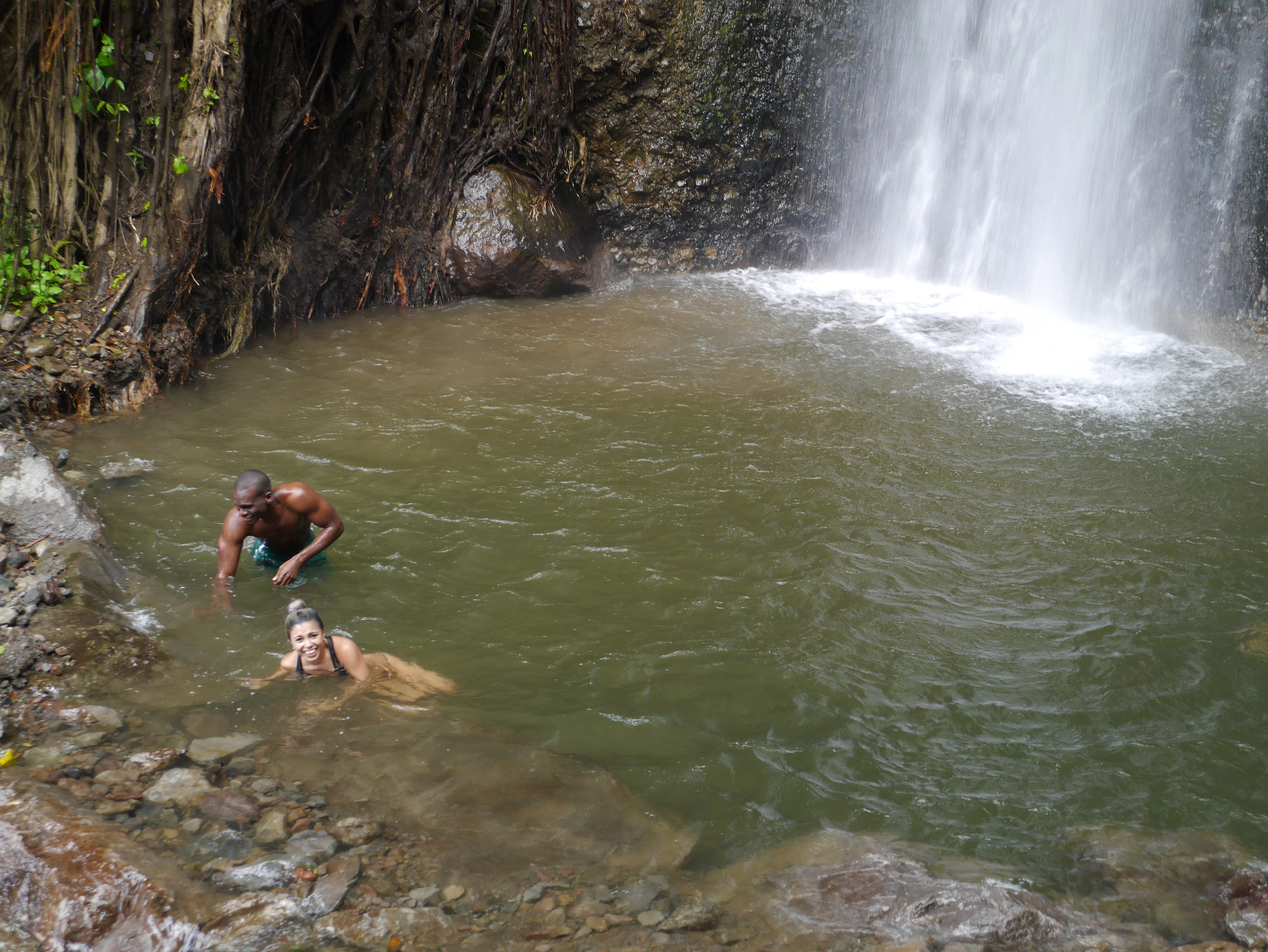 We finally arrived at the Dark View Falls near the town of Richmond. This is after our tour guide stopped by some friendly neighbourhood dealers and grabbed a handful of very green Vincy (that’s marijuana) to show off to our British tour-mate. Anyway, Dark View Falls are gorgeous, but FREEZING cold. In fact all of the water in St Vincent seems to be freezing cold, but the Falls took WIN. We braved the cold water because we’d come too far not to. There you can see Louis (Brit) enjoying the refreshing pool while Kern and I contemplated how best to approach this popsicle situation.